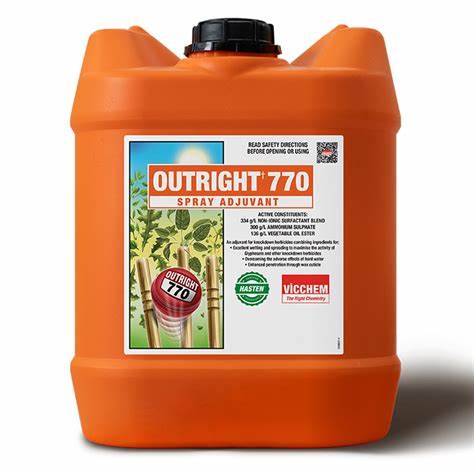Outright 770 Spray Adjuvant is a unique spray adjuvant combining the benefits of Esterified Seed Oils, Non-ionic Surfactants and Ammonium Sulphate in an easy-to-use liquid formulation that is compatible with a wide range of knockdown herbicides.