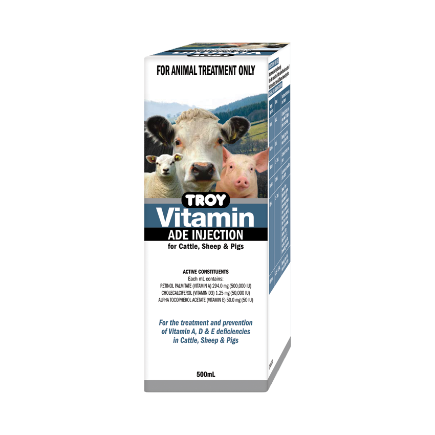 Troy Vitamin ADE Injection is an oil-based injection for the treatment and prevention of vitamin A, D and E deficiencies in cattle, sheep and pigs.