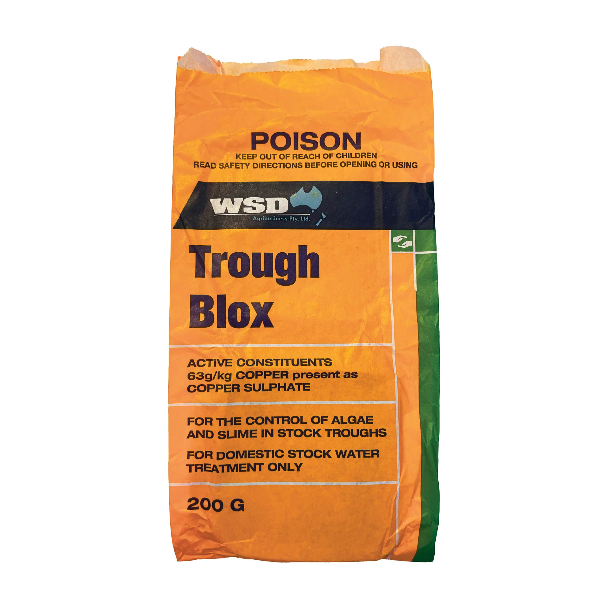 WSD trough bloxs are for the control of algae and slime in stock troughs (plastic & concrete). WSD Trough Blox also provides a copper supplement to livestock.